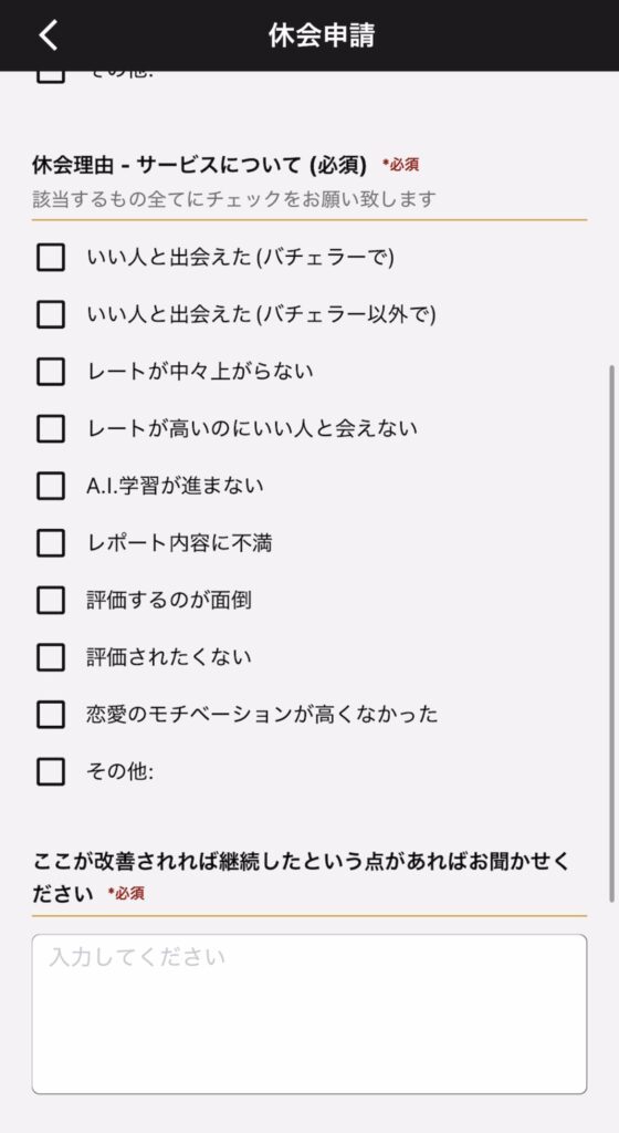 画面に従い、「休会理由(デートについて/サービスについて)」「ここが改善されれば継続したという点」「その他ご意見」を入力します。